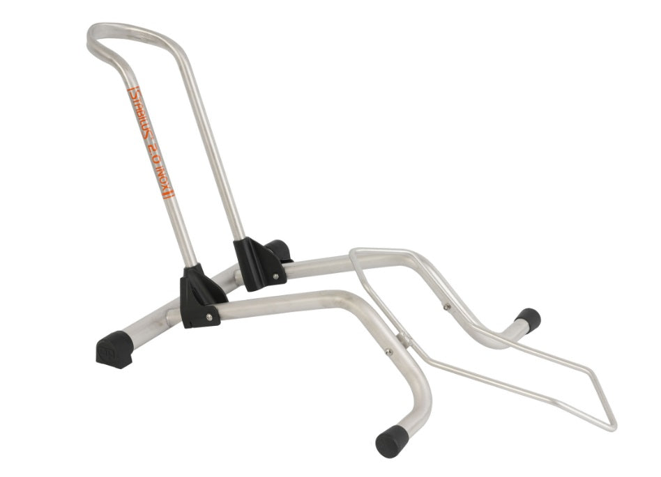 The Stabilus 2.0 is the further development of the Stabilus. What distinguishes this bike stand from its predecessor is the possibility to fold it. With this system, it can be taken anywhere thanks to a practical bag that is included. The Stabilus 2.0 Inox bike stand is suitable for all types of bikes: from e-bikes to road bikes. It weighs only 2.5 kg and measures 44x41x15cm when closed. Like the Stabilus, the Stabilus 2.0 Inox has an innovative swing system and offers excellent stability on both the rear and front wheel. In addition, it rests only on the tires and does not damage the spokes or the frame.