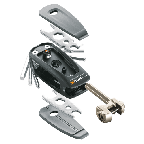 The innovative concept of the CT-WORX mini tool for touring and racing bikes: extremely functional and compact. The handy tool made of stainless chrome vanadium tool steel is especially suitable for bikes with a gear hub.