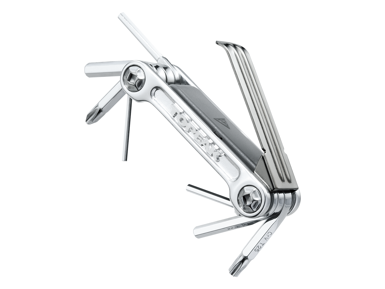 9 function pro quality tool folds in a sleek forged alloy body. An additional removable folding tire lever stores inside the tool body for a streamlined profile. Perfect for long road rides or endurance mountain biking. Includes a neoprene bag.