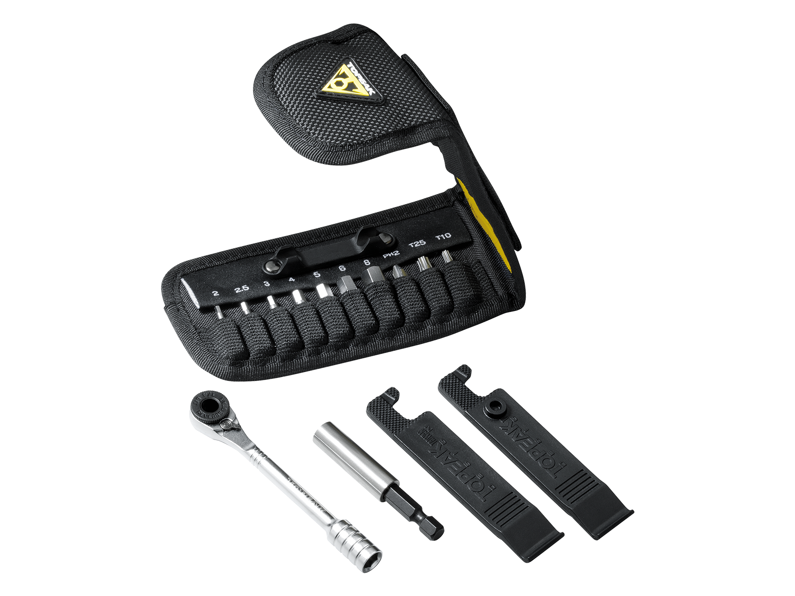 Features a fine tooth ratchet mechanism with reverse lever and thumb wheel for quick rotation and control in tight spots and includes hardened steel tools in 2, 2.5, 3, 4, 5, 6 and 8 mm hex, T10, T15, T25 Torx® and #2 Phillips bits, two engineering grade polymer tire levers and magnetic bit holder.